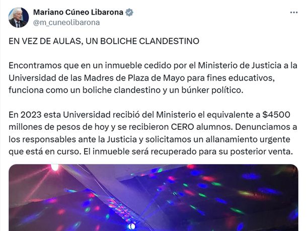 Como ya se informó, Mariano Cúneo Libarona denunció este jueves el allanamiento de lo que describió como un "boliche clandestino y búnker político" que funcionaba en un inmueble cedido por el Gobierno “para fines educativos” a la Universidad Nacional de Madres de Plaza de Mayo.