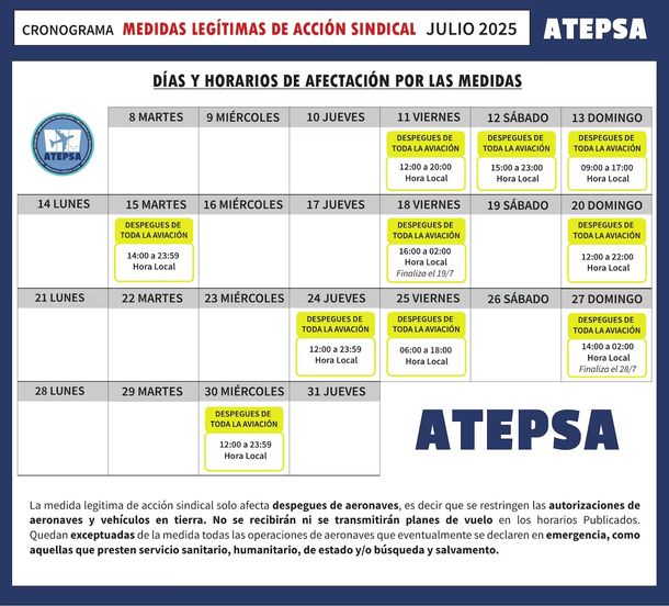 La Asociación Técnicos y Empleados de Protección y Seguridad a la Aeronavegación (ATEPSA) anunció una serie de paros escalonados en distintos horarios desde el 11 hasta el 30 de julio, lo que afectarán las partidas de vuelos nacionales e internacionales dentro de franjas horarias específicas, que van desde las 6 de la mañana hasta la medianoche, variando según el día.