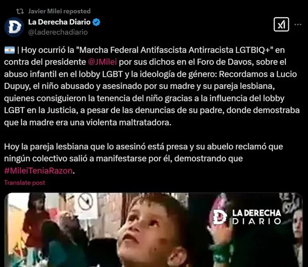 El post de La derecha diario hacía referencia a Lucio Dupuy, el niño que fue asesinado por su madre y su pareja. "Recordamos a Lucio Dupuy, el niño abusado y asesinado por su madre y su pareja lesbiana, quienes consiguieron la tenencia del niño gracias a la influencia del lobby LGBT en la Justicia, a pesar de las denuncias de su padre, que mostraban a la madre como una violenta maltratadora", fue parte de lo publicado, alineándose con comentarios previos de Milei en el Foro Económico de Davos.