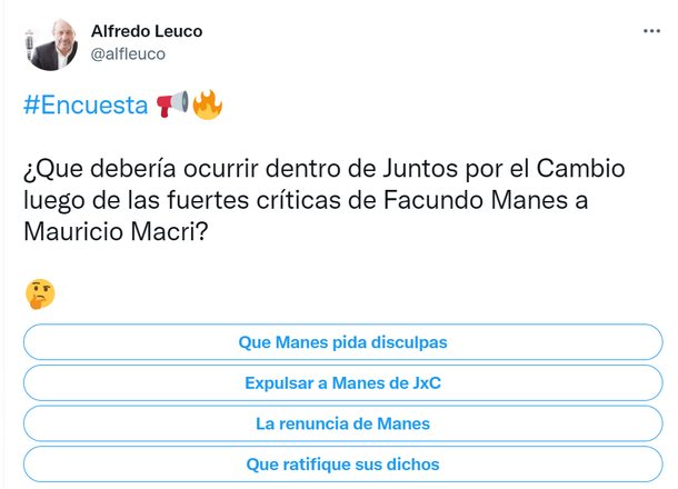 "¿Que debería ocurrir dentro de Juntos por el Cambio luego de las fuertes críticas de Facundo Manes a Mauricio Macri?", se pregunta Leuco, Alfredo. Y pone cuatro opciones, le faltó la quinta, que es que Manes vaya de rodillas hasta Luján pidiendo disculpas.