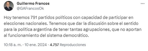 Guillermo Francos también cuestionó la cantidad de agrupaciones políticas que existen en el país y consideró que "tal vez haya que discutir en algún momento cuál es el sentido que tiene para la política argentina tener la cantidad de partidos que hay en la actualidad".