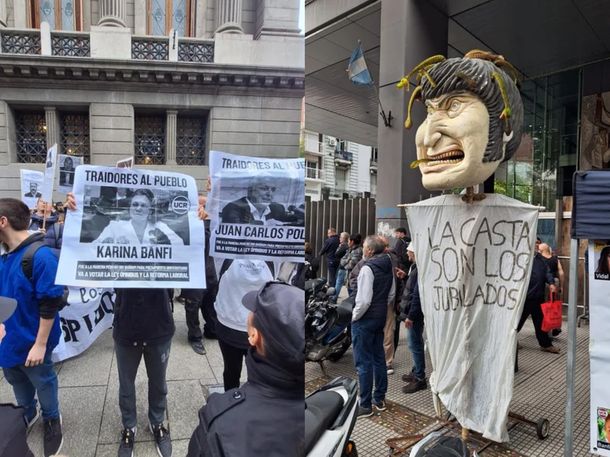 "Traidores a la Patria", afirmaba un cartel con los rostros y los nombres de los diputados de esas bancadas que acompañarán la votación firmado por el Frente de Trabajadores jubilados.