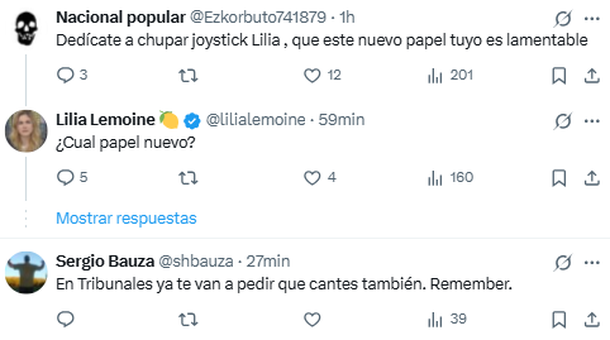 Como era de esperarse, el video no tardó en viralizarse y en cosechar comentarios mayoritariamente negativos: "Dedicate a chupar joystick Lilia, que este nuevo papel tuyo es lamentable"; "En Tribunales ya te van a pedir que cantes también. Remember"; "¿Y a vos por cuánto tiempo te seguiremos manteniendo?"; "Poca gente, ¿por qué no ampliaron el plano?"; "Vamos a ver cuando te haga cantar la Justicia"; fueron sólo algunos de los comentarios en contra de la diputada.