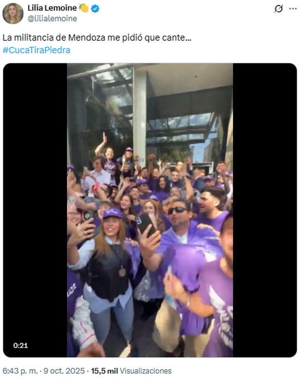 Allí, fue filmada cantando "Kuka tira piedra" junto a jóvenes adherentes al Gobierno nacional y compartió el clip en sus redes sociales: "La militancia de Mendoza me pidió que cante... #CucaTiraPiedra", escribió en su cuenta de X, dando paso a un nuevo acto delirante a los que nos tiene acostumbrados.