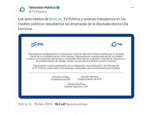 "Las autoridades de @rta_se, TV Pública y quienes trabajamos en los medios públicos repudiamos las amenazas de la diputada electa Lilia Lemoine", informaron mediante X para sumarle, a esto, su comunicado oficial. En el mismo se pueden ver las firmas de Rosario Lufrano, la presidenta de RTA; Osvaldo Santoro, el vicepresidente de RTA y Claudio Martínez, el director ejecutivo de TVP.