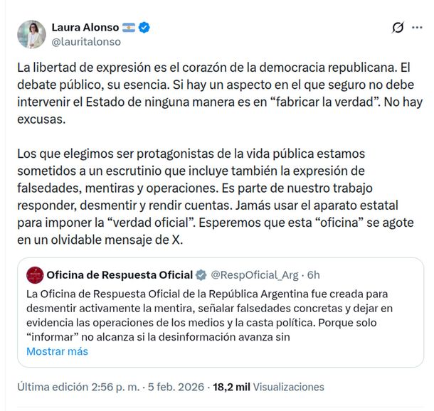 Quizás por eso Alonso señaló el deber de "jamás usar el aparato estatal para imponer la 'verdad oficial'", y agregó un deseo: Esperemos que esta 'oficina' se agote en un olvidable mensaje de X".