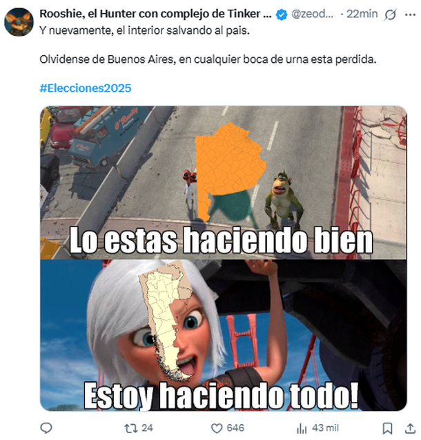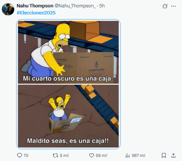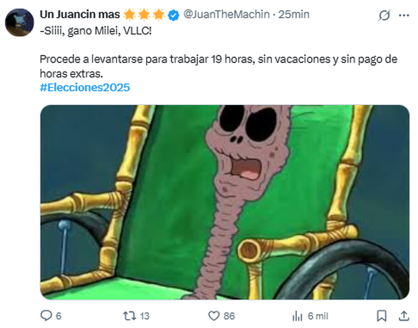 Este domingo se llevaron a cabo las elecciones legislativas nacionales, con un inesperado y holgado triunfo de La Libertad Avanza, que sacó casi el 41% del total de votos. En medio de una jornada que se desarrolló con tranquilidad y algunos bloopers, las redes sociales reaccionaron con los más creativos memes para dar cierre a los comicios que definen el nuevo Congreso de la Nación.
