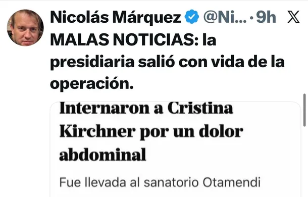 En la misma línea, el escritor Nicolás Márquez, biógrafo del presidente Javier Milei y denunciado en una causa por abuso sexual de menores, publicó un mensaje de extrema dureza en el que se refirió a Cristina Kirchner como "la presidiaria" y calificó como una "mala noticia" que la intervención quirúrgica hubiera sido exitosa, lo que generó un fuerte rechazo en la red social X.