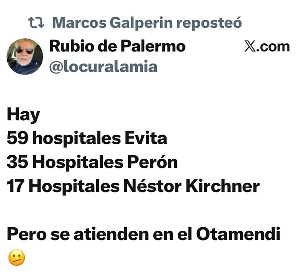 El mensaje enumera la cantidad de hospitales públicos que llevan nombres vinculados al peronismo —59 hospitales Evita, 35 hospitales Perón y 17 hospitales Néstor Kirchner— y concluye señalando que, pese a esa infraestructura, la ex mandataria fue atendida en una clínica privada.