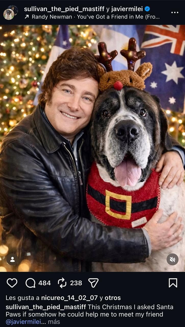 El mandatario arrancó la Nochebuena eliminado un posteo, y luego, en su cuenta de Instagram, Milei compartió una publicación hecha con IA donde aparece abrazando a Sullivan, un perro influencer de Australia.