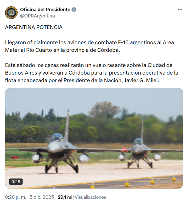 Por su parte, la Oficina del Presidente informó que “este sábado los cazas realizarán un vuelo rasante sobre la Ciudad de Buenos Aires y volverán a Córdoba para la presentación operativa de la flota encabezada por el Presidente de la Nación, Javier G. Milei”.