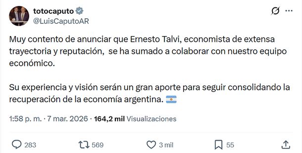 Al republicar el posteo de su jefe, el viceministro de Economía, José Luis Daza, celebró la contratación: “Sensacional anuncio del ministro Luis Caputo. Se incorpora al equipo el extraordinario economista Ernesto Talvi”.