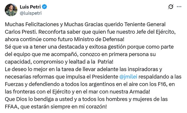 “Le deseo lo mejor en la tarea de llevar adelante las inspiradoras y necesarias reformas que impulsa el Presidente Javier Milei respaldando a las Fuerzas y defendiendo a todos los argentinos en el aire con los F16, en las fronteras con el Ejército y en el mar con nuestra Armada. Que Dios lo bendiga a usted y a todos los hombres y mujeres de las FFAA, que estarán siempre en mi corazón”, completó Petri a través de un posteo en X.