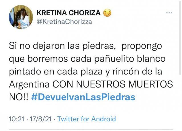Ante la falta de propuestas, la oposición una vez más utilizó la tragedia para hacer campaña y luego de que el Gobierno anunciara que va a realizar un monumento para conmemorar a las víctimas de la pandemia con las piedras que quedaron de la marcha, en Twitter se hizo tendencia el #Devuelvanlaspiedras y muchos de los usuarios comenzaron con ataques hacia las Abuelas y Madres de Plaza de Mayo.