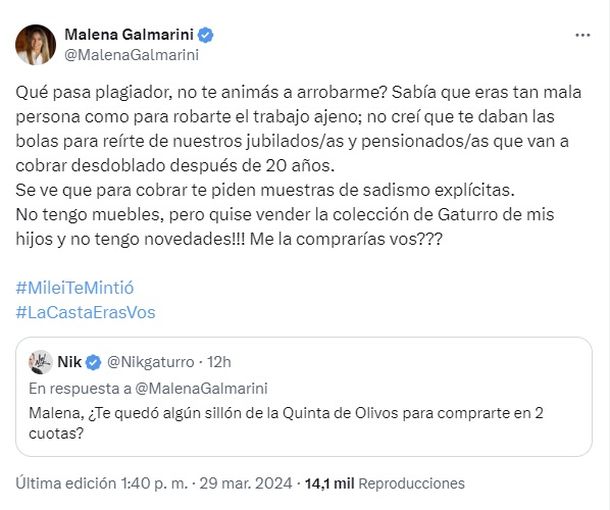 Ante esto, Galmarini lo cruzó con un extenso mensaje: “Qué pasa plagiador, ¿no te animás a arrobarme? Sabía que eras tan mala persona como para robarte el trabajo ajeno; no creí que te daban las bolas para reírte de nuestros jubilados/as y pensionados/as que van a cobrar desdoblado después de 20 años. Se ve que para cobrar te piden muestras de sadismo explícitas. No tengo muebles, pero quise vender la colección de Gaturro de mis hijos y no tengo novedades!!! Me la comprarías vos???”.