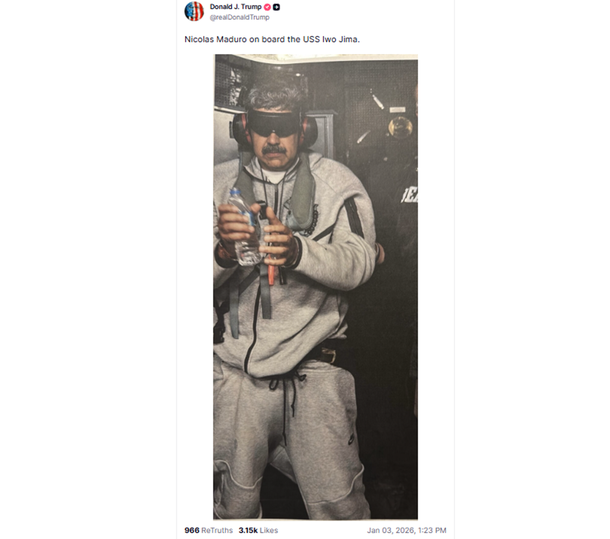 La confirmación visual del arresto llegó de la mano del propio Donald Trump, quien difundió una fotografía de Maduro bajo custodia. En la imagen se lo puede ver esposado, vistiendo ropa deportiva gris y elementos de protección, una postal que simboliza el fin de su ciclo en el poder tras el operativo que comenzó en la madrugada de este sábado.