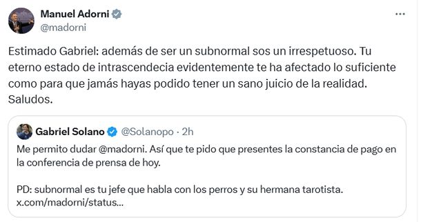 Manuel Adorni cruzó a Gabriel Solano: "Subnormal e irrespetuoso".