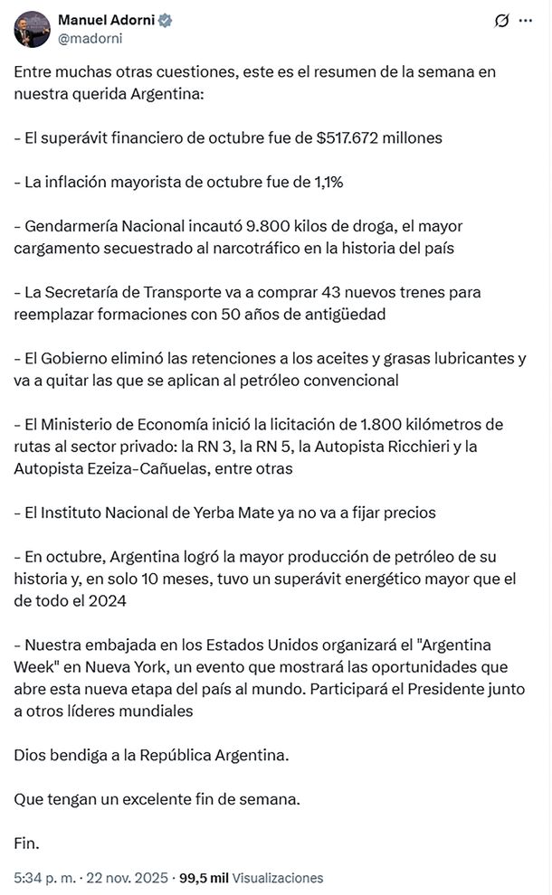 “Dios bendiga a la República Argentina. Que tengan un excelente fin de semana. Fin”, concluye el funcionario su publicación de este sábado en la red social X.