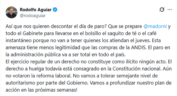 "¿Así que nos quieren descontar el día de paro? Que se prepare @madorni y todo el Gabinete para llevarse en el bolsillo el saquito de té o el café instantáneo porque no van a tener quienes los atiendan el jueves".