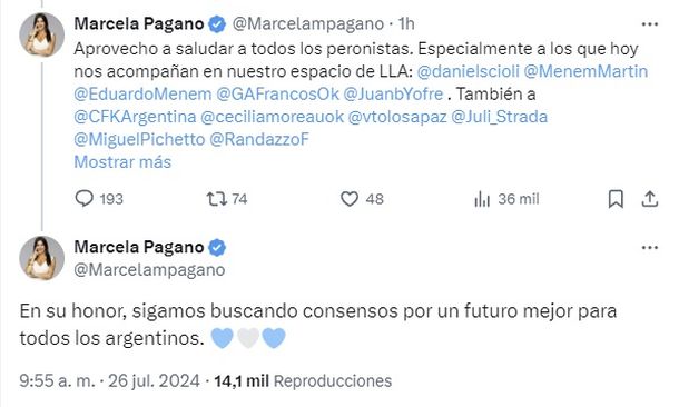 A 72 años de la muerte de Eva Perón, la diputada libertaria Marcela Pagano publicó un homenaje para la "abanderada de los humildes" y saludó a la expresidenta Cristina Kirchner junto a otros dirigentes peronistas, provocando todo tipo de reacciones de los simpatizantes de La Libertad Avanza.
