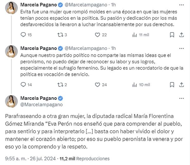 Acto seguido, le dedicó tres posteos más en los cuales describió que “Evita fue una mujer que rompió moldes en una época en que las mujeres tenían pocos espacios en la política. Su pasión y dedicación por los más desfavorecidos la llevaron a luchar incansablemente por sus derechos”.