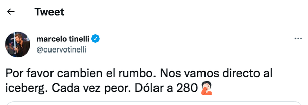 "Por favor cambien el rumbo. Nos vamos directo al iceberg. Cada vez peor. Dólar a 280", escribió Tinelli en sus redes sociales.