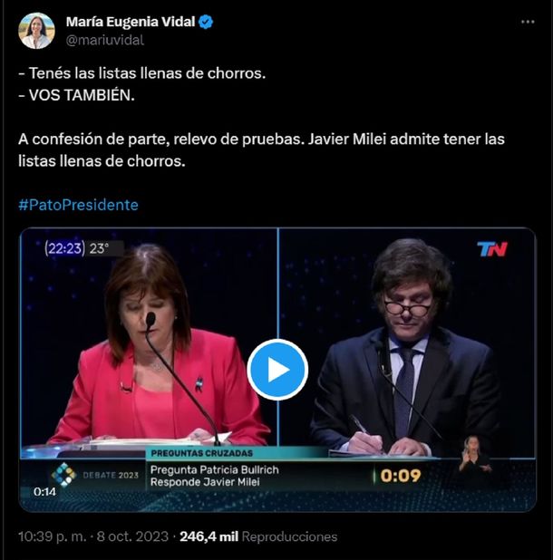 Esto fue replicado torpemente por María Eugenia Vidal en su cuenta de Twitter, quien escribió: "-Tenés las listas llenas de chorros. -VOS TAMBIÉN. A confesión de parte, relevo de pruebas. Javier Milei admite tener las listas llenas de chorros. #PatoPresidenta".