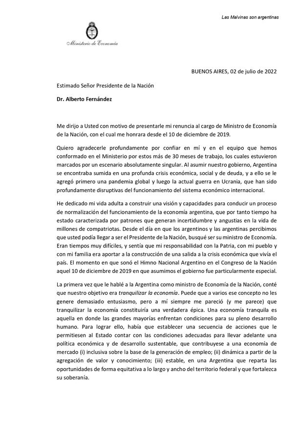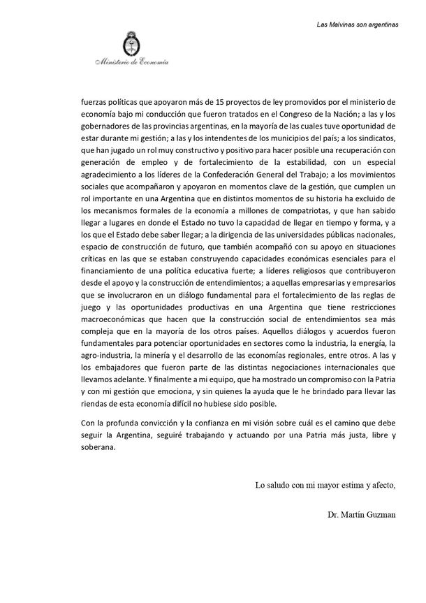 En su carta de renuncia al presidente Alberto Fernández, el ahora ex ministro de Economía, Martín Guzmán, le agradeció su confianza y consideró "un verdadero honor acompañarlo en la tarea de poner a nuestro país de pie".