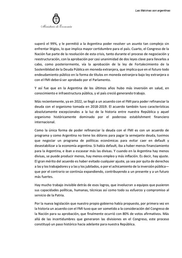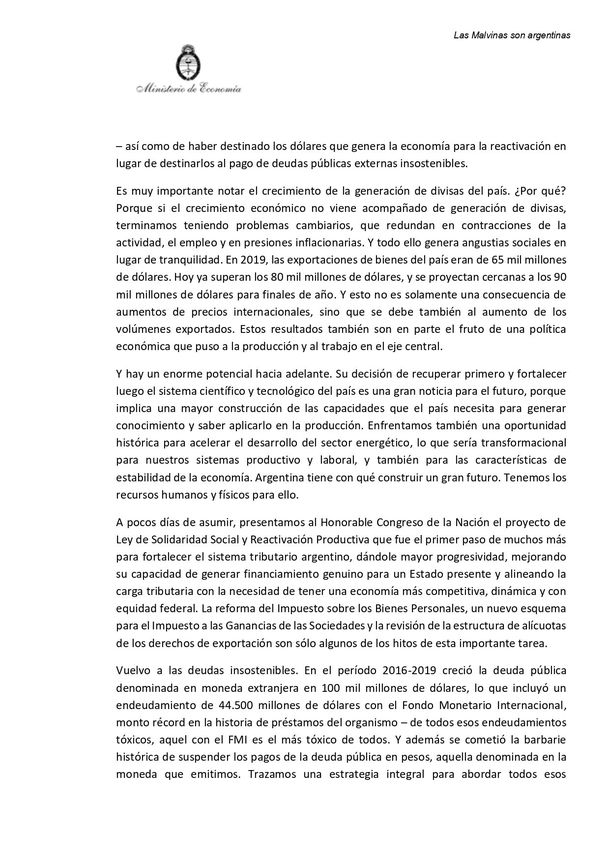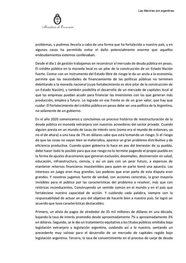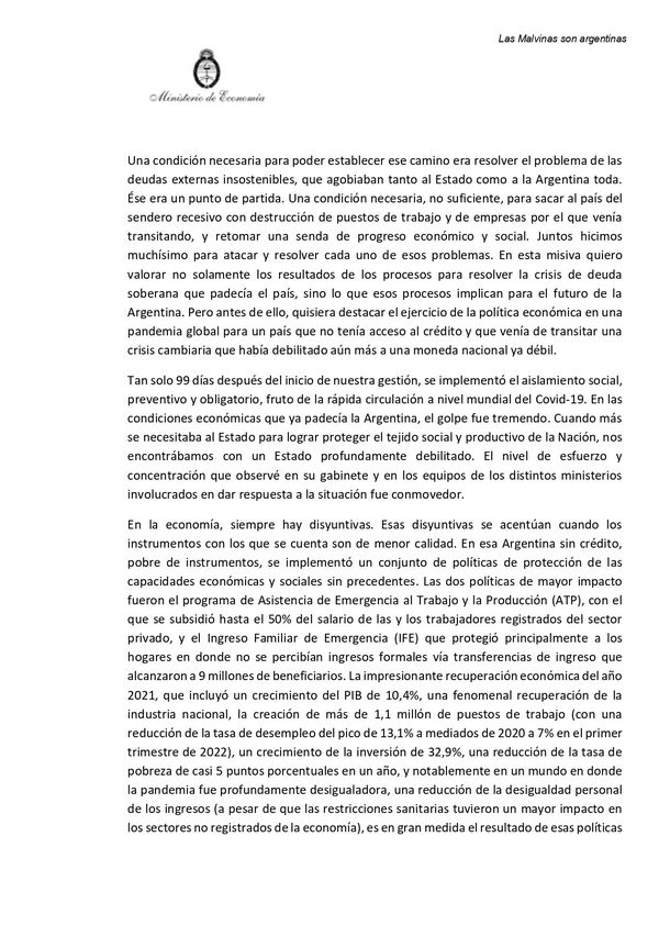 Para Guzmán, "será primordial que trabaje en un acuerdo político dentro de la coalición gobernante para que quien me reemplace, que tendrá por delante esta alta responsabilidad, cuente con el manejo centralizado de los instrumentos de política macroeconómica necesarios para consolidar los avances descriptos y hacer frente a los desafíos por delante".