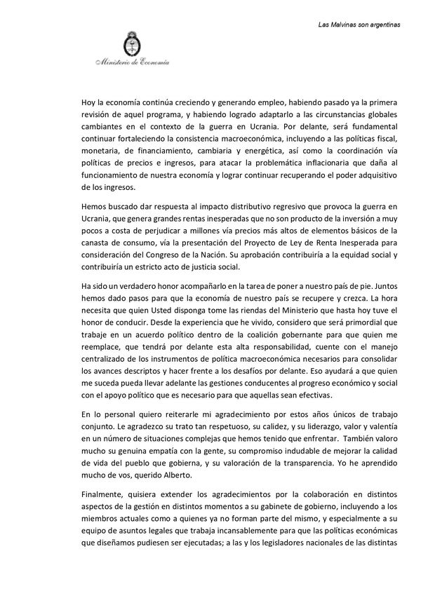 "Juntos hemos dado pasos para que la economía de nuestro país se recupere y crezca. La hora necesita que quien Usted disponga tome las riendas del Ministerio que hasta hoy tuve el honor de conducir", afirmó, tras realizar un extenso análisis de su gestión al frente de la cartera.