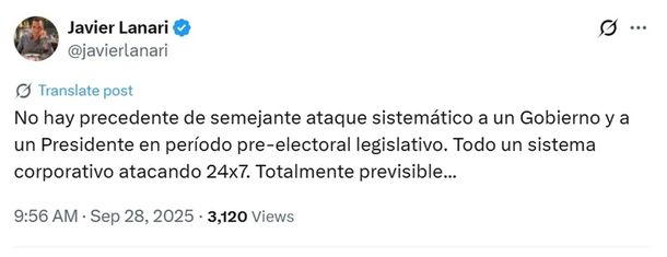 En este sentido, el subsecretario de Prensa, Javier Lanari, publicó en su cuenta de X: "No hay precedente de semejante ataque sistemático a un Gobierno y a un Presidente en período pre-electoral legislativo. Todo un sistema corporativo atacando 24x7. Totalmente previsible".