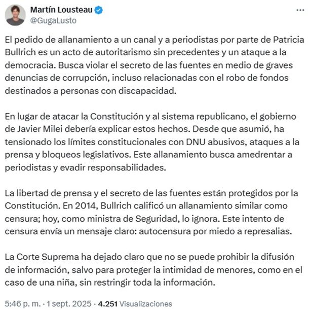 Asimismo, Lousteau indicó: "La libertad de prensa y el secreto de las fuentes están protegidos por la Constitución. En 2014, Bullrich calificó un allanamiento similar como censura; hoy, como ministra de Seguridad, lo ignora. Este intento de censura envía un mensaje claro: autocensura por miedo a represalias".