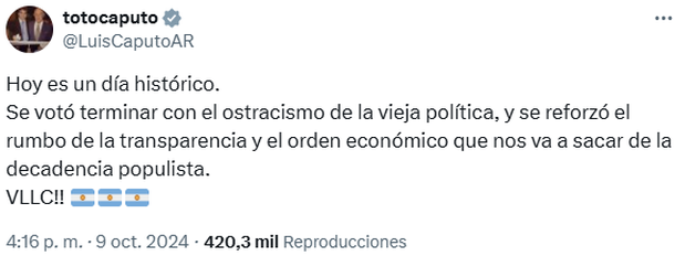 A través de un mensaje en X que cerró con una bandera argentina y las letras "VLLC", en honor al grito de guerra preferido del Presidente, el ministro de Economía aplaudió así la votación que terminó de dejar sin validez la Ley de Financiamiento Universitario, que había sido aprobada por el Senado el 13 de septiembre pasado.