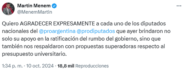 Con énfasis en algunas palabras, el funcionario manifestó: "Quiero AGRADECER EXPRESAMENTE a cada uno de los diputados nacionales del @proargentina @prodiputados que ayer brindaron no solo su apoyo en la ratificación del rumbo del gobierno, sino que también nos respaldaron con propuestas superadoras respecto al presupuesto universitario".