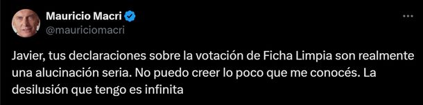 Ante esto, el titular del PRO usó sus redes sociales para responderle: "Javier, tus declaraciones sobre la votación de Ficha Limpia son realmente una alucinación seria. No puedo creer lo poco que me conocés. La desilusión que tengo es infinita", expresó, citando el video publicado por la actual candidata a legisladores por la Ciudad de Buenos Aires.