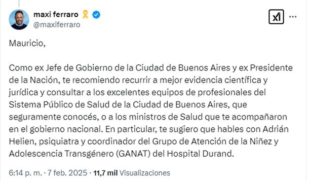"Como ex jefe de Gobierno de la Ciudad de Buenos Aires y ex Presidente, te recomiendo recurrir a mejor evidencia científica y jurídica y consultar a los excelentes equipos de profesionales del Sistema Público de Salud de la Ciudad de Buenos Aires, que seguramente conocés, o a los ministros de Salud que te acompañaron en el gobierno nacional", le reclamó Ferraro.