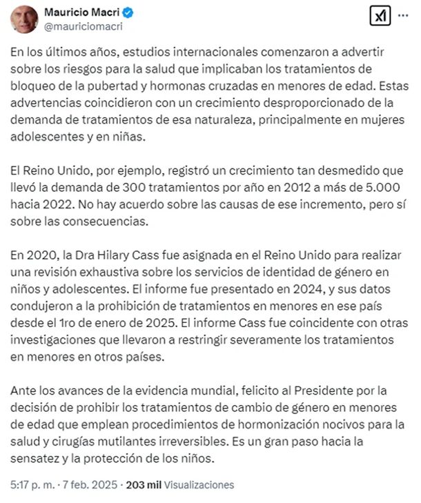 En ese sentido, Macri advierte que "en 2020, la Dra. Hilary Cass fue asignada en el Reino Unido para realizar una revisión exhaustiva sobre los servicios de identidad de género en niños y adolescentes. El informe fue presentado en 2024, y sus datos condujeron a la prohibición de tratamientos en menores en ese país desde el 1ro de enero de 2025. El informe Cass fue coincidente con otras investigaciones que llevaron a restringir severamente los tratamientos en menores en otros países", añadió.