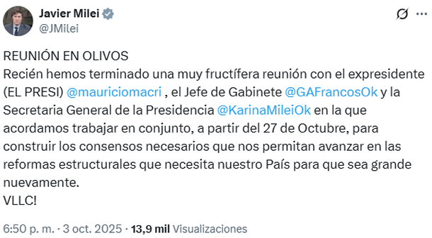 Tras un primer encuentro luego de más de un año de no hablarse, Mauricio Macri y Javier Milei estuvieron juntos en la tarde de este viernes. Posterior a la reunión, el primer mandatario posteó en X: "REUNIÓN EN OLIVOS. Recién hemos terminado una muy fructífera reunión con el expresidente (EL PRESI) @mauriciomacri, el jefe de Gabinete @GAFrancosOk y la secretaria general de la Presidencia @KarinaMileiOk en la que acordamos trabajar en conjunto, a partir del 27 de octubre, para construir los consensos necesarios que nos permitan avanzar en las reformas estructurales que necesita nuestro País para que sea grande nuevamente. VLLC!", escribió Milei.