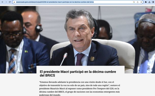 "'Estamos llevando adelante la presidencia con una visión desde el Sur, con el objetivo de transmitir la voz no solo de un país, sino de toda una región', sostuvo el presidente Mauricio Macri al exponer como presidente Pro Tempore del G20, en la décima cumbre del BRICS, el grupo de naciones con las economías emergentes más poderosas del mundo", comenzaba la gacetilla oficial.