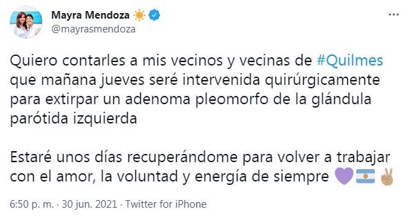 La intendenta había informado ayer en sus redes sociales sobre su operación: “Quiero contarles a mis vecinos y vecinas de Quilmes que mañana jueves seré intervenida quirúrgicamente para extirpar un adenoma pleomorfo de la glándula parótida izquierda”, escribió Mendoza en su cuenta de Twitter había señalado: “Estaré unos días recuperándome para volver a trabajar con el amor, la voluntad y energía de siempre”.