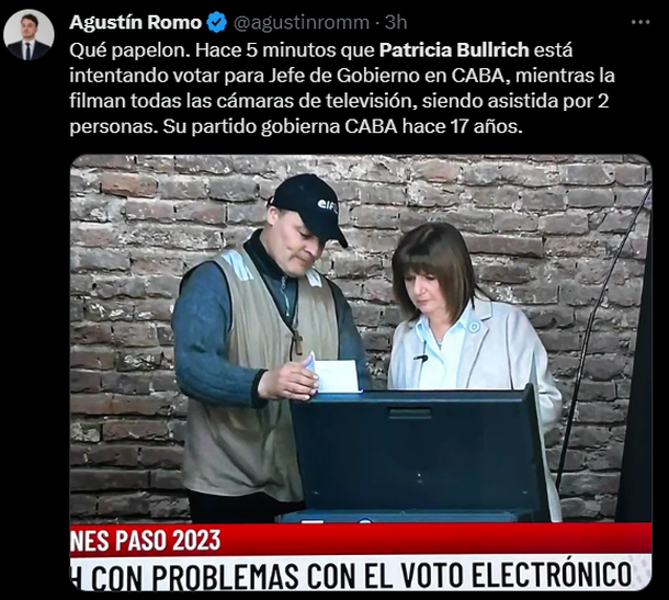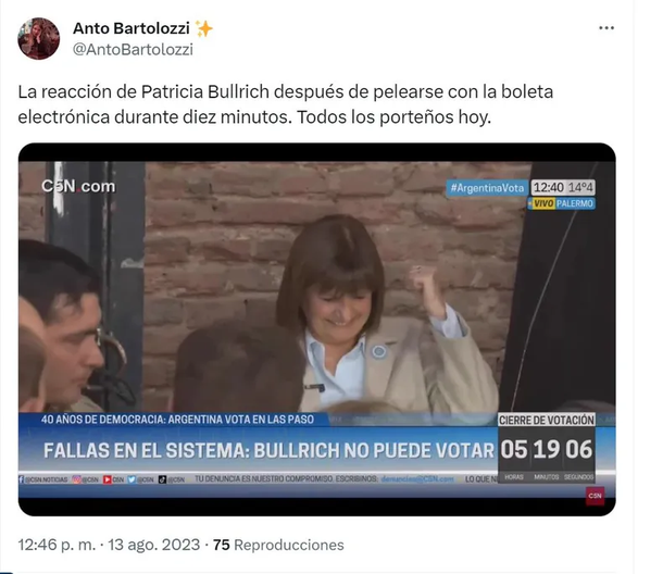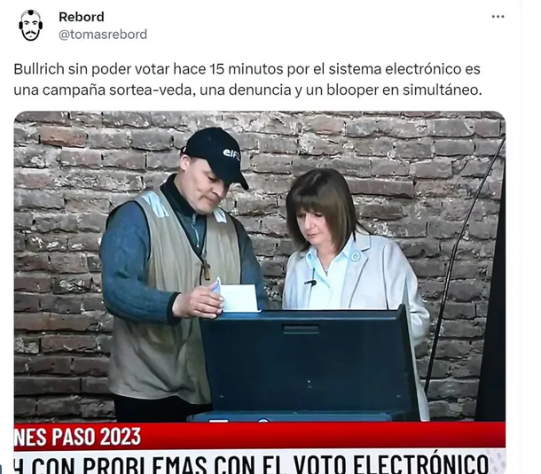 Un insólito momento se vivió en la jornada electoral de este domingo cuando la precandidata presidencial de Juntos por el Cambio, Patricia Bullrich, intentó ejercer su derecho a voto en la nueva modalidad electrónica en la Ciudad de Buenos Aires. Debió repetir el procedimiento varias veces porque la máquina no funcionaba.
