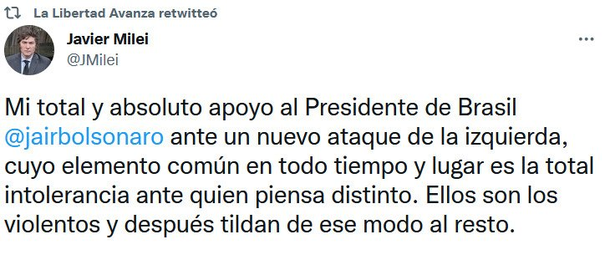 En aquel momento, había escrito en un tuit: "Mi total y absoluto apoyo al Presidente de Brasil Jair Bolsonaro ante un nuevo ataque de la izquierda, cuyo elemento común en todo tiempo y lugar es la total intolerancia ante quien piensa distinto. Ellos son los violentos y después tilda de ese modo al resto".