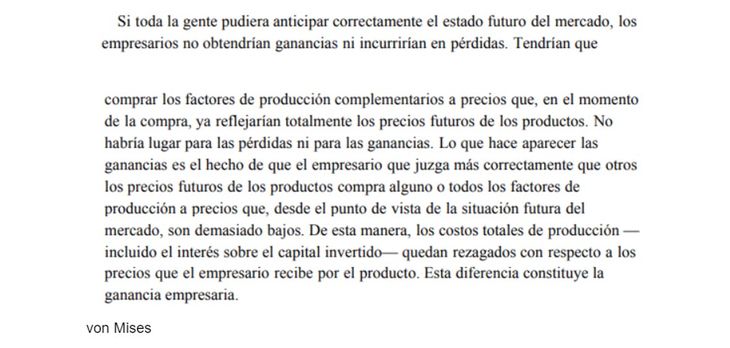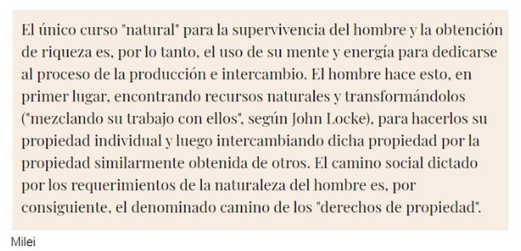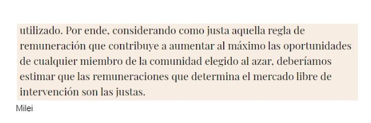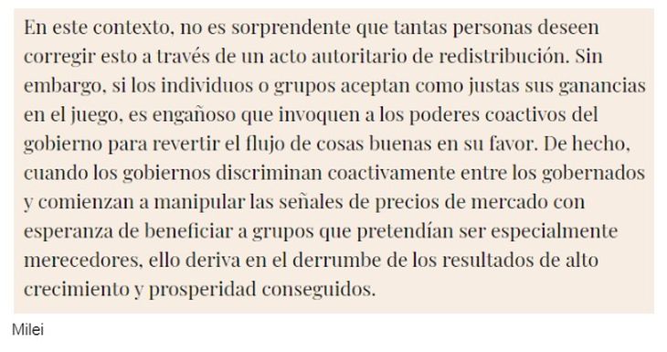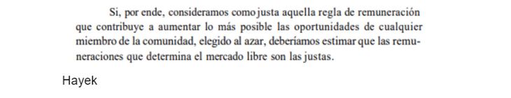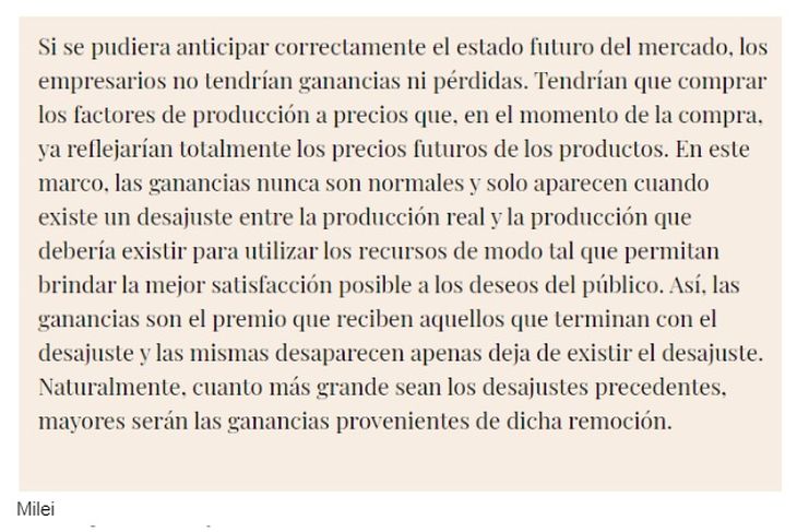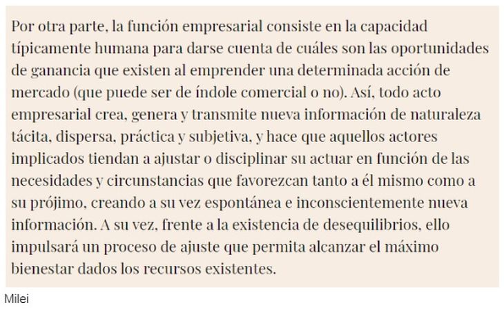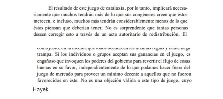 En párrafos anteriores a los citados, Milei menciona a Hayek - “el proceso de mercado, tal como lo señalara Hayek, se corresponde a la definición de juego” -, pero en el resto del texto no atribuye las citas textuales a ese autor.