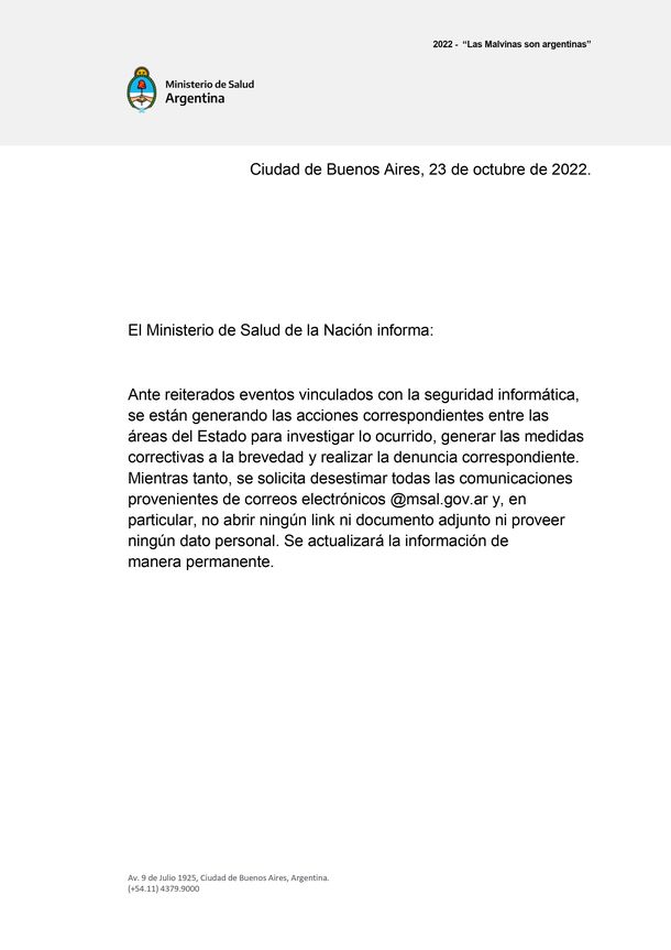 Como advertencia, indicaron que “se solicita desestimar todas las comunicaciones provenientes de correos electrónicos @msal.gov.ar y, en particular, no abrir ningún link ni documento adjunto ni proveer ningún dato personal. Se actualizará la información de manera permanente”.