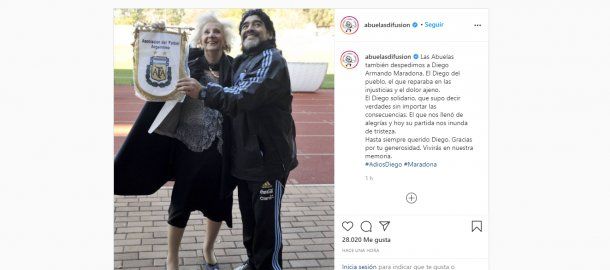 "Las Abuelas también despedimos a Diego Armando Maradona. El Diego del pueblo, el que reparaba en las injusticias y el dolor ajeno. El Diego solidario, que supo decir verdades sin importar las consecuencias. El que nos llenó de alegrías y hoy su partida nos inunda de tristeza. Hasta siempre querido Diego. Gracias por tu generosidad. Vivirás en nuestra memoria. #AdiosDiego #Maradona ", fue el mensaje de la agrupación de Derechos Humanos lidera por Estela de Carlotto en sus redes.