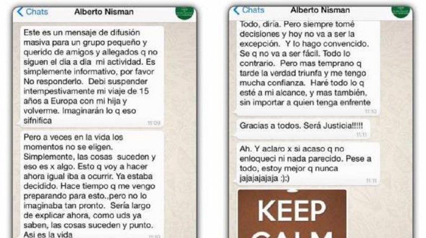"Debí suspender intempestivamente mi viaje de 15 años a Europa con mi hija y volverme. Imaginarán lo que eso significa. Pero a veces en la vida los momentos no se eligen. Simplemente las cosas suceden. Y eso es por algo", había escrito Nisman por Whatsapp a sus allegados.