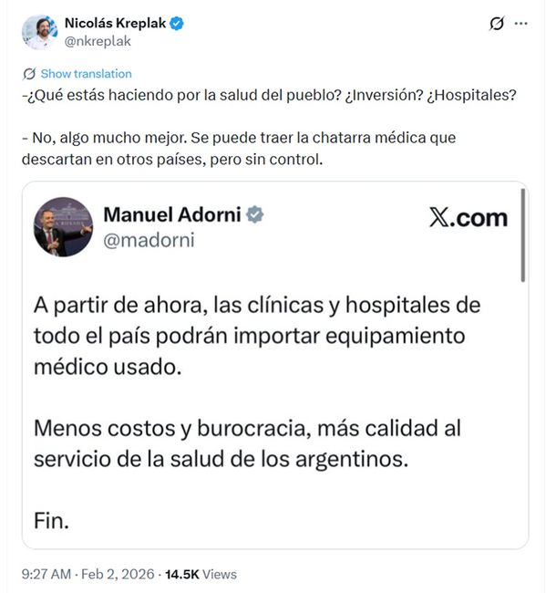 El irónico tuit de Kreplak fue en respuesta al autocelebratorio que había publicado minutos antes Adorni. El Jefe de Gabinete había celebrado la flexibilizaciones de las condiciones para la importación de equipamiento médico usado desde distintas partes del mundo. La medida quedó plasmada en la Disposición 224/2026 de la Administración Nacional de Medicamentos, Alimentos y Tecnología Médica (Anmat) publicada hoy en el Boletín Oficial.