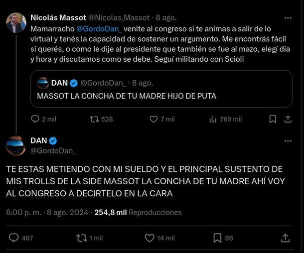 "Massot la c..." empezaba la lista de epítetos enunciados el jueves de esta semana por "El Gordo Dan" en X, a lo que el integrante de Hacemos Coalición Federal le espetó: "Mamarracho. Venite al congreso, si te animas a salir de lo virtual y tenés la capacidad de sostener un argumento".