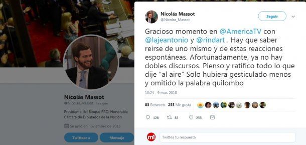 “Gracioso momento en @AmericaTV con @lajeantonio y @rindart . Hay que saber reírse de uno mismo y de estas reacciones espontáneas. Afortunadamente, ya no hay dobles discursos. Pienso y ratifico todo lo que dije “al aire” Solo hubiera gesticulado menos y omitido la palabra quilombo”, lanzó Nicolás Massot desde su cuenta de Twitter.