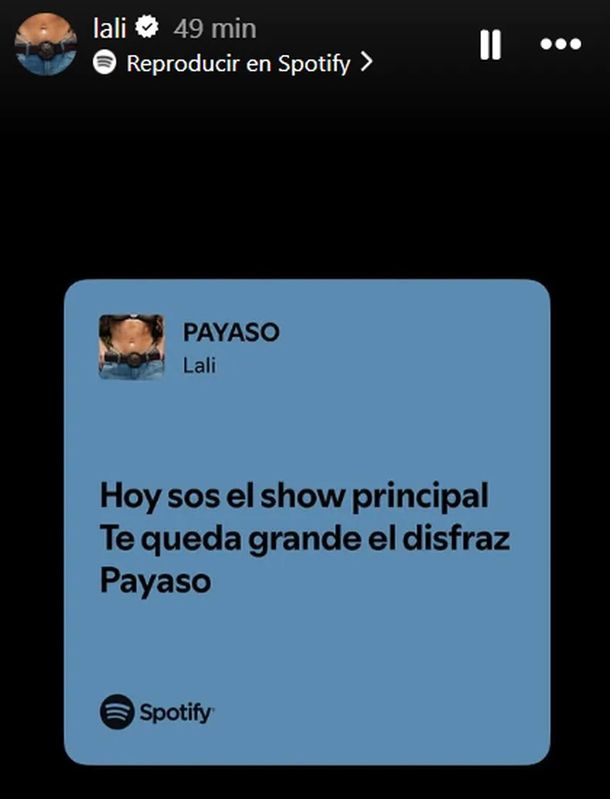 En ese clima, Lali Espósito realizó una serie de publicaciones en su cuenta de Instagram que fueron leídas como un mensaje con destinatario implícito. Aunque no mencionó nombres propios ni hizo referencias directas, el contenido fue interpretado por sus seguidores como una respuesta cargada de ironía. Una de las historias mostraba un fragmento de su canción Payaso, con los versos: “Hoy sos el show principal / Te queda grande el disfraz /Payaso”. La otra consistió en un video de carácter informativo que abordaba justamente la situación de los incendios en el sur del país, lo que reforzó la lectura de una crítica indirecta en medio del nuevo capítulo de este prolongado cruce público.